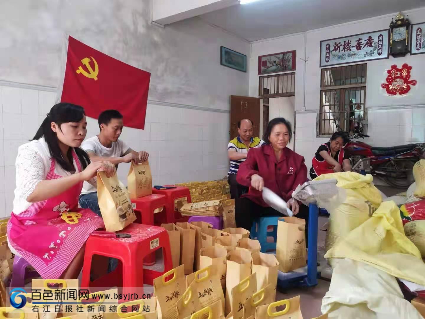 党员先锋队队员在打包装袋五谷杂粮。